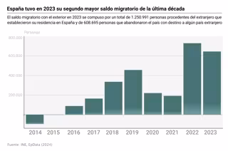 El saldo migratorio de España con el exterior (la diferencia entre immigraciones y emigraciones exteriores) fue en 2023, con 642.296 personas, el segundo más positivo de la última década, solo superado por 2022, según se desprende de la Estadística de Migraciones y Cambios de Residencia (EMCR) correspondiente al año pasado y publicada este jueves por el Instituto Nacional de Estadística (INE).