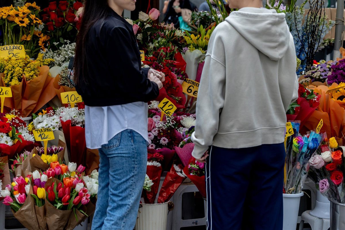 Dos personas en un puesto del Mercado de Flores de Tirso de Molina, a 3 de mayo de 2025, en Madrid (España). - Ricardo Rubio - Europa Press