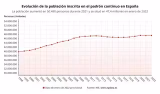 El total de personas inscritas en el Padrón Continuo en España a 1 de enero de 2022 es de 47.435.597 habitantes, por lo que el número de habitantes en el país ha crecido en el año 2021 en un total de 50.490 (un 0,1%) personas con respecto a 2020, según el avance de la Estadística del Padrón Continuo que el Instituto Nacional de Estadística (INE) ha hecho pública este jueves. De este modo, recuperando gran parte del descenso registrado en 2020, primer año de pandemia, cuando perdió 65.688 empadronados.