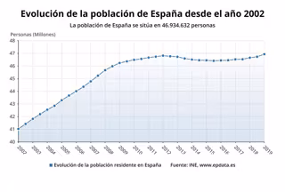 Las cifras estadísticas de población en España a 1 de enero de 2019 son las más altas desde que hay registros, con 46,9 millones de personas. Se trata del crecimiento más elevado desde 2008 (cuando la población aumentó en 570.333 personas), que permite superar el anterior valor histórico más alto, alcanzado en 2012.