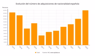 Las adquisiciones de nacionalidad española aumentaron un 32,3% en 2023, respecto al año anterior, hasta 240.208. Esta cifra es la más alta desde que comenzó la serie, en 2013, según los datos publicados este viernes de la Estadística de adquisiciones de nacionalidad española de residentes. Año 2023', del Instituto Nacional de Estadística (INE).