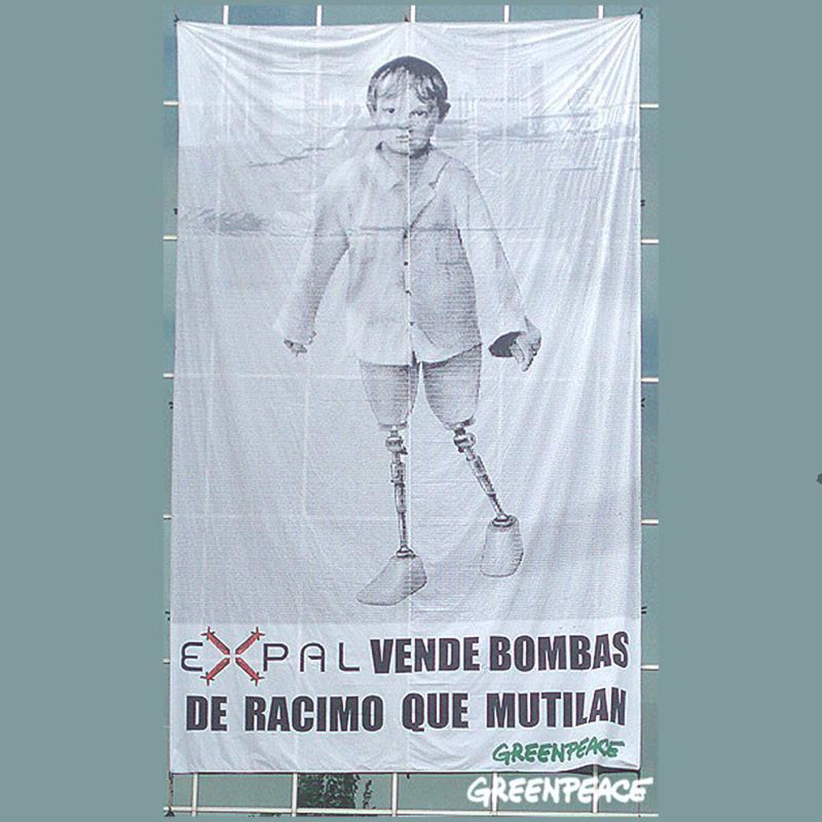 Activistas de la organización ecologista Greenpeace desplegaron este jueves en Madrid una pancarta gigante en la fachada de la compañía Explosivos Alaveses (Expal) e introdujeron en el edificio prótesis de personas amputadas y siluetas de cartón representando a las víctimas, en una acción para manifestar su rechazo a las bombas de racimo.