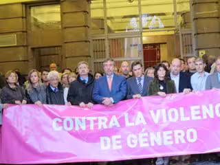 Representantes institucionales, junto con algunos ciudadanos se han concentrado esta mañana en el patio de la entrada del Ayuntamiento de Zaragoza, debido a la intensa lluvia que caía, y han desplegado una pancarta encabezada por el alcalde, Juan Alberto Belloch, en la que se podía leer "Contra la violencia de género".
