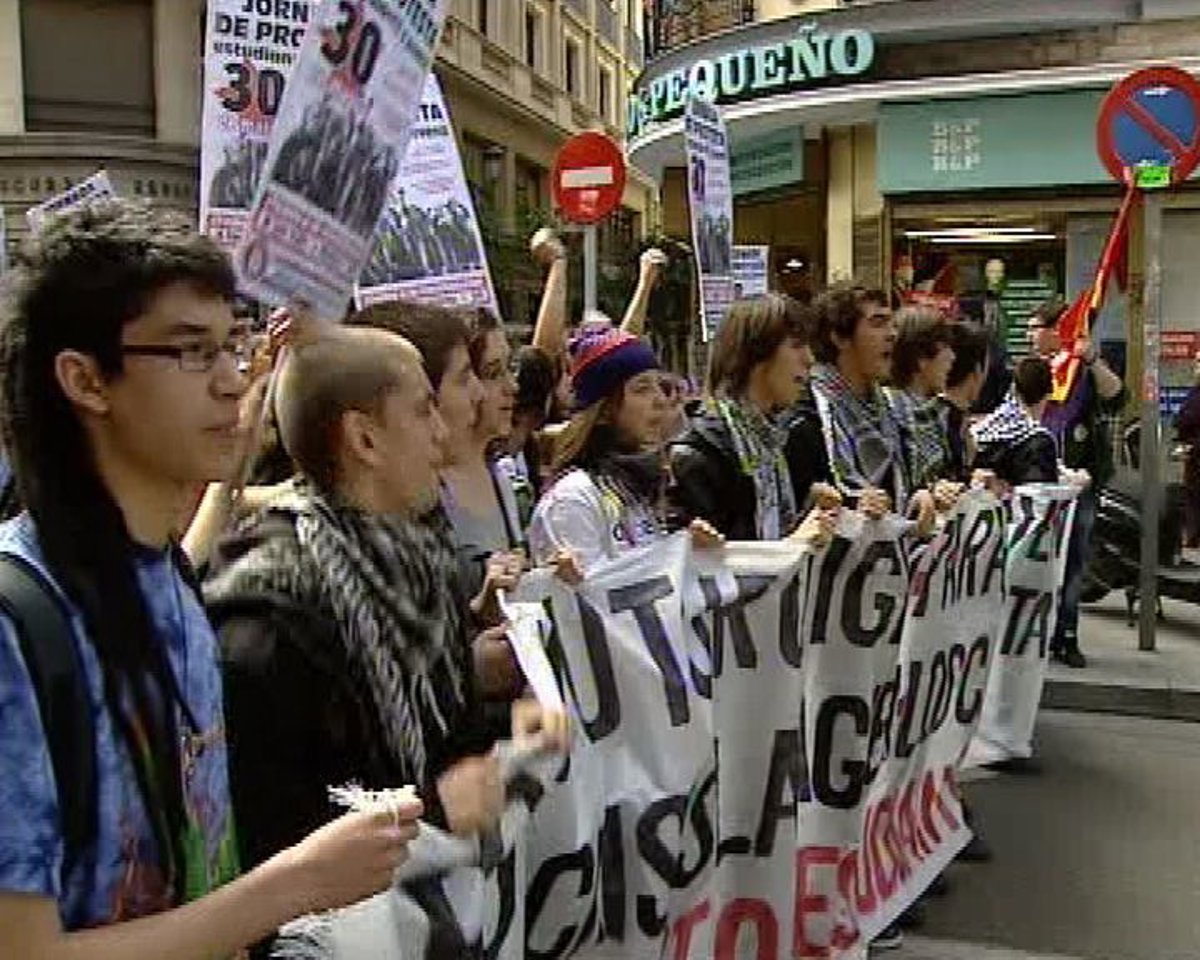 Estudiantes se han manifestado en Madrid contra los recortes de las Administraciones Públicas en Educación y contra la reforma laboral. Según el sindicato de Estudiantes, que ha organizado esta manifestación, la participación ha sido de 2.000 estudiantes, mientras que la Policía cifra la participación en torno a las 700 personas.