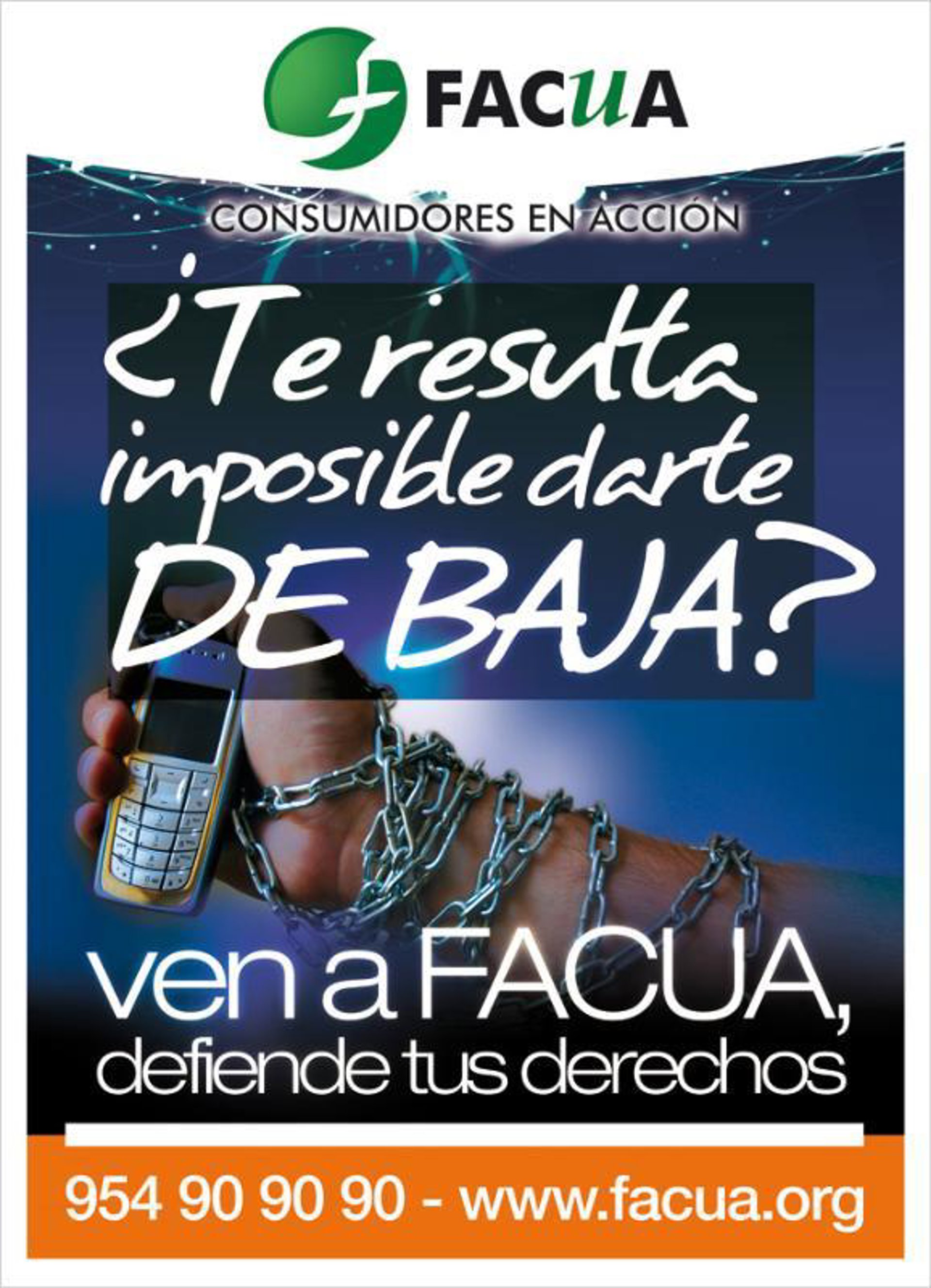 La primera de las tres imágenes que conforman la nueva campaña está protagonizada por la telefonía móvil y muestra la fotografía de un brazo encadenado a un terminal junto al texto '¿Te resulta imposible darte de baja?'.