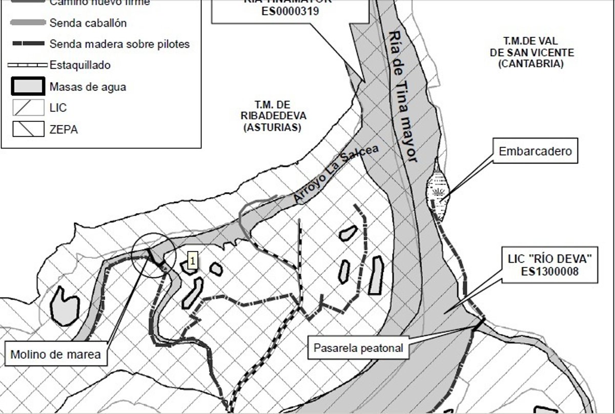 Una de las actuaciones a realizar en la ría de Tina Mayor es la construcción de una pasarela peatonal apoyada sobre pilares hincados en el terreno. Al respecto, y pese a que el promotor afirma que su construcción es perfectamente compatible con la conservación de un estado hídrico óptimo en el entorno de la ría, se compromete a minimizar la longitud total de estos tramos, planteando la no ejecución del tramo de pasarela más cercano al arroyo Salcea.