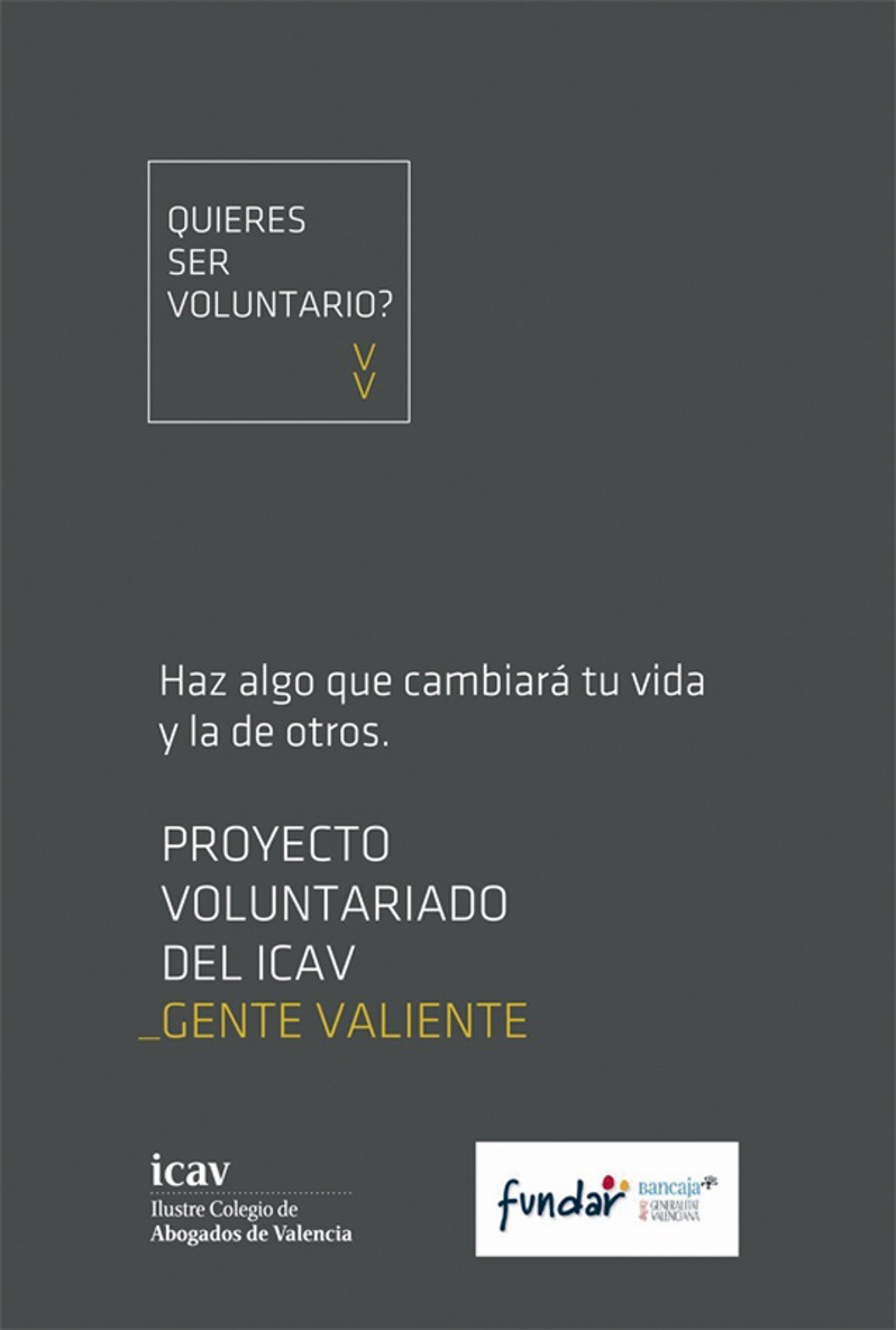 El Ilustre Colegio de Abogados de Valencia (ICAV) promoverá entre sus colegiados y empleados, a partir del próximo mes de septiembre, un proyecto de voluntariado profesional y voluntariado corporativo con el fin de fomentar el espíritu solidario de los abogados y recabar su ayuda para quienes más lo necesitan, según ha informado esta institución en un comunicado.