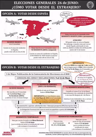 Tampoco se han ampliado, como se pedía, los plazos para registrarse. "El censo electoral de emigrantes permanentes cerró en marzo cuando se publicó la convocatoria de elecciones para el 26J. En ese momento, la alternativa de inscribirse en los consulados como residente temporal dejó de ser una opción para quienes se registraron hace un año con motivo de las autonómicas y municipales, limitándose así su derecho al voto", dice la Marea Granate.