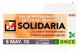 La Organización Nacional de Ciegos Españoles (ONCE) dedicará el cupón correspondiente al sorteo del próximo domingo, 8 de mayo, a la casilla para Fines Sociales de la Declaración de la Renta, con el objetivo de que el número de personas que marque la casilla del 0,7 por ciento en su declaración sea "aún mayor" y las organizaciones dedicadas a esta labor social "puedan hacer más por las personas que lo necesitan".