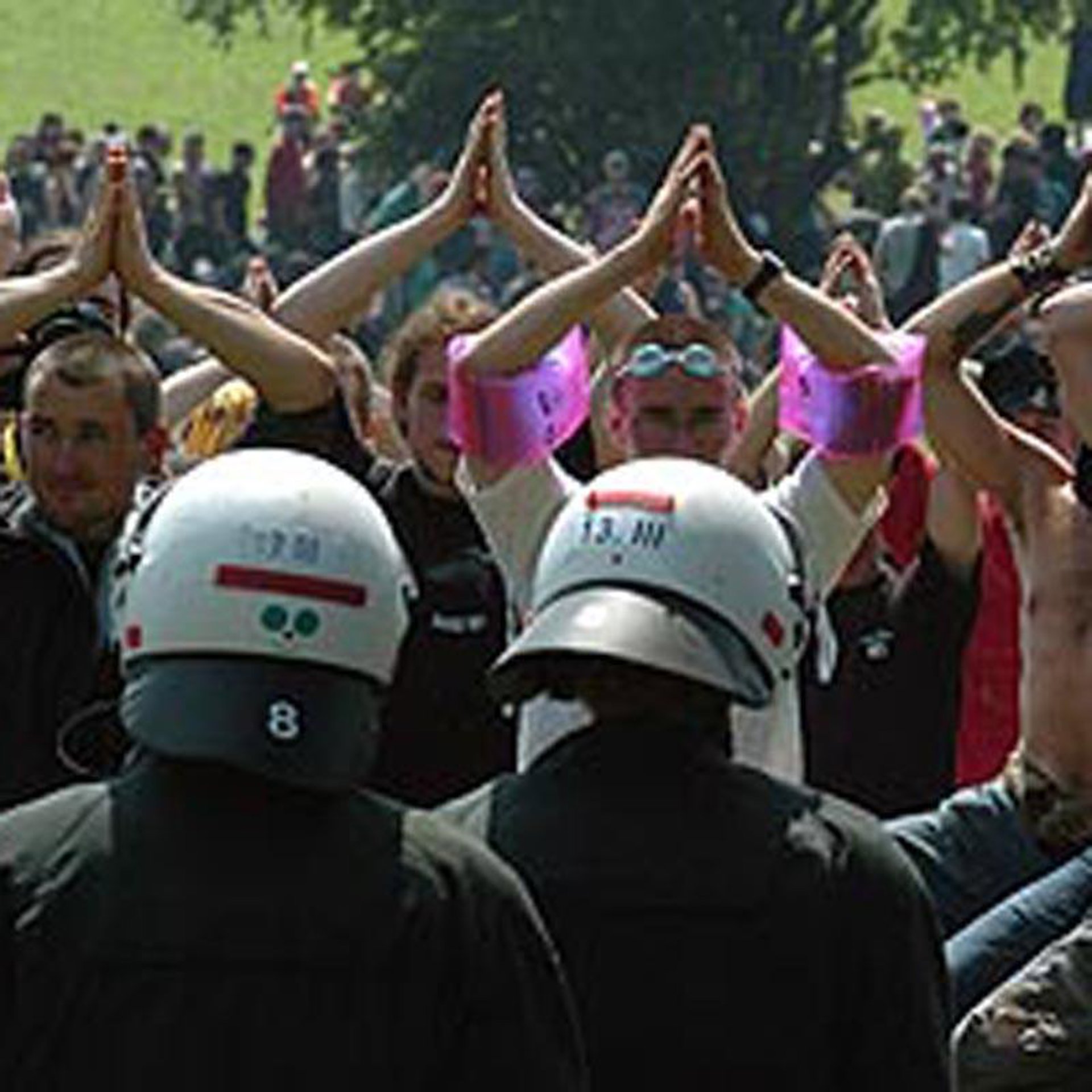 No obstante, grupos reducidos formados por una combinación de anarquistas, antibelicistas y activistas ambientales aumentaron la tensión de las manifestaciones con el lanzamiento de objetos a los agentes entre los que figuraban botellas, piezas de fruta, huevos y pintura, así como despojándolos de los cascos que portaban y lanzando bombas de humo. Los policías, por su parte, se defendieron con sus porras reglamentarias y empleando esprays disuasorios.