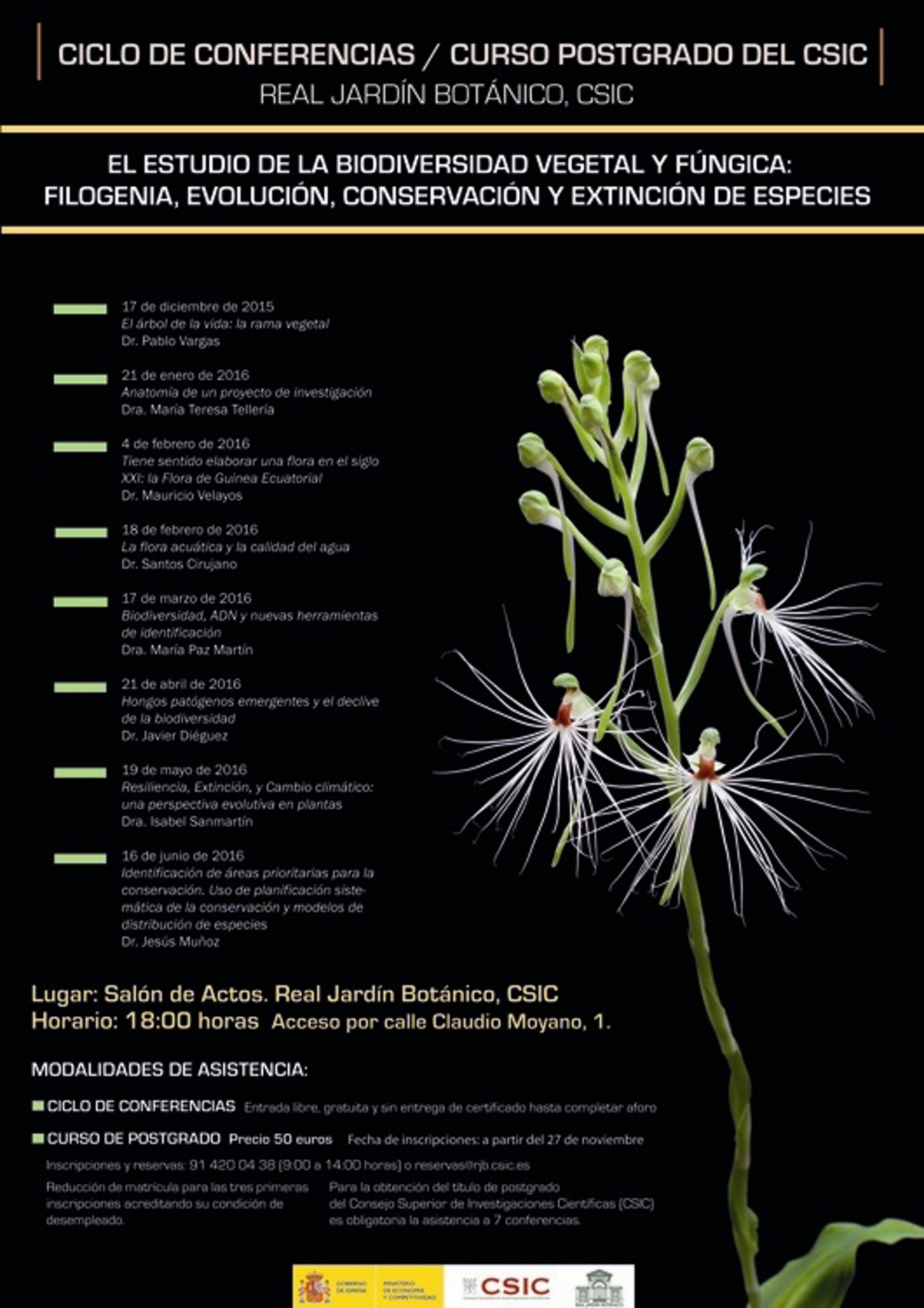 Concretamente, el 17 de diciembre tendrá lugar 'El árbol de la vida: la rama vegetal'; el 21 de enero de 2016, la conferencia 'Anatomía de un proyecto de investigación'; el 4 de febrero está programada 'Tiene sentido elaborar una flora en el siglo XXI: la Flora de Guinea Ecuatorial'; el 18 de febrero, 'La flora acuática y la calidad del agua'; el 17 de marzo 'Biodiversidad, AND y nuevas herramientas de identificación'; el 21 de abril 'Hongos patógenos emergentes y el declive de la biodiversidad'; el 19 de mayo 'Resiliencia, extinción y cambio climático: una perspectiva evolutiva en plantas'; y por último, el 16 de junio, 'Identificación de áreas prioritarias para la conservación: uso de planificación sistemática de la conservación y modelos de distribución de especies'.
