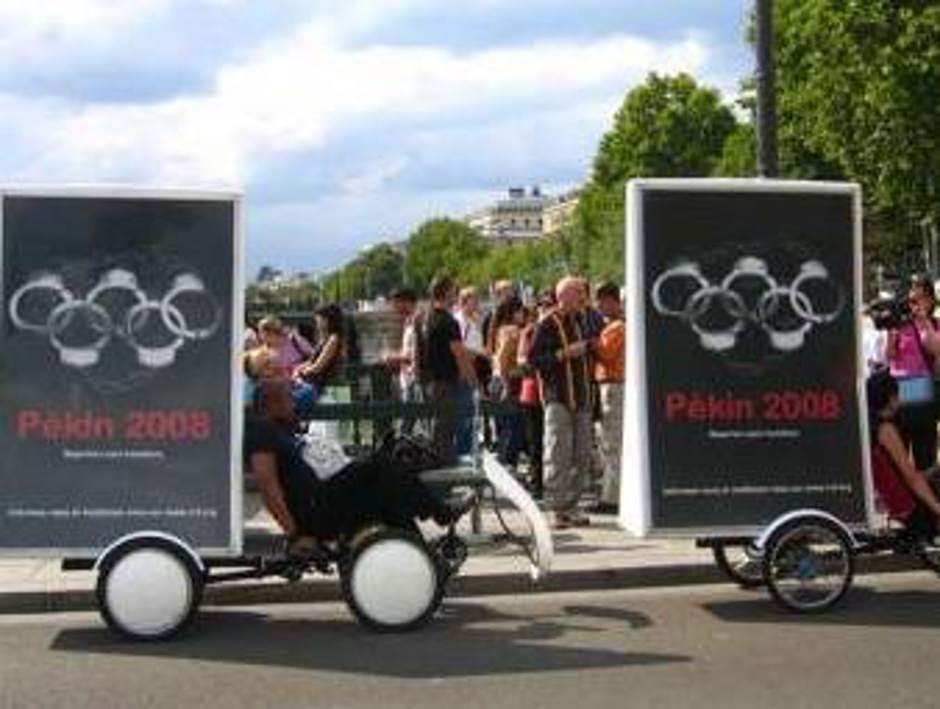 La movilización de hoy, que se ha desarrollado a partir de Mediodía en el barrio comercial de los Grandes Almacenes de París, los militantes han ofrecido a los transeúntes hacerse una fotografía con la camiseta de la campaña 'Pékin 2008', que lleva impresos los aros olímpicos en forma de esposas mientras en una pantalla gigante se exhibía un spot sobre los periodistas encarcelados.