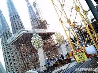 Más de una quincena de activistas de Greenpeace desplegaron este lunes una pancarta de 600 metros cuadrados en las grúas de la Sagrada Familia de Barcelona con el mensaje 'World leaders make the climate call' (Líderes mundiales tomad la decisión de salvar el clima), con motivo del comienzo de la cumbre de Naciones Unidas sobre el clima.
