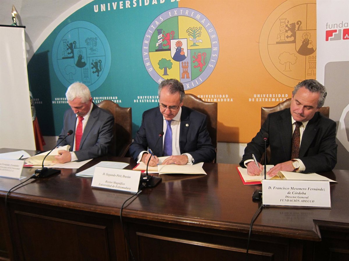 El rector de la Universidad de Extremadura, Segundo Piriz, el director de Relaciones con Universidades de Indra, Carlos Fernández, y el director general de Fundación Adecco, Francisco Mesonero, han firmado este jueves en Cáceres este nuevo proyecto de I+D+i, que da continuidad al compromiso de las tres entidades con el desarrollo de soluciones y servicios que faciliten el acceso a la tecnología y la integración social y laboral de las personas con discapacidad.