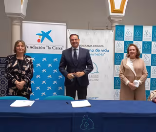 La directora territorial de CaixaBank en Andalucía Occidental y Extremadura, María Jesús Catalá; y el presidente del Patronato Fundación Gota de Leche, Antonio Millán Jiménez, han anunciado la renovación de la colaboración de la Fundación la Caixa, a través de CaixaBank, con Fundación Gota de Leche en el Proyecto Crianza, cuyo objetivo es la atención social y sanitaria a niños de Andalucía Occidental (Cádiz, Huelva y Sevilla) en situación de exclusión.
