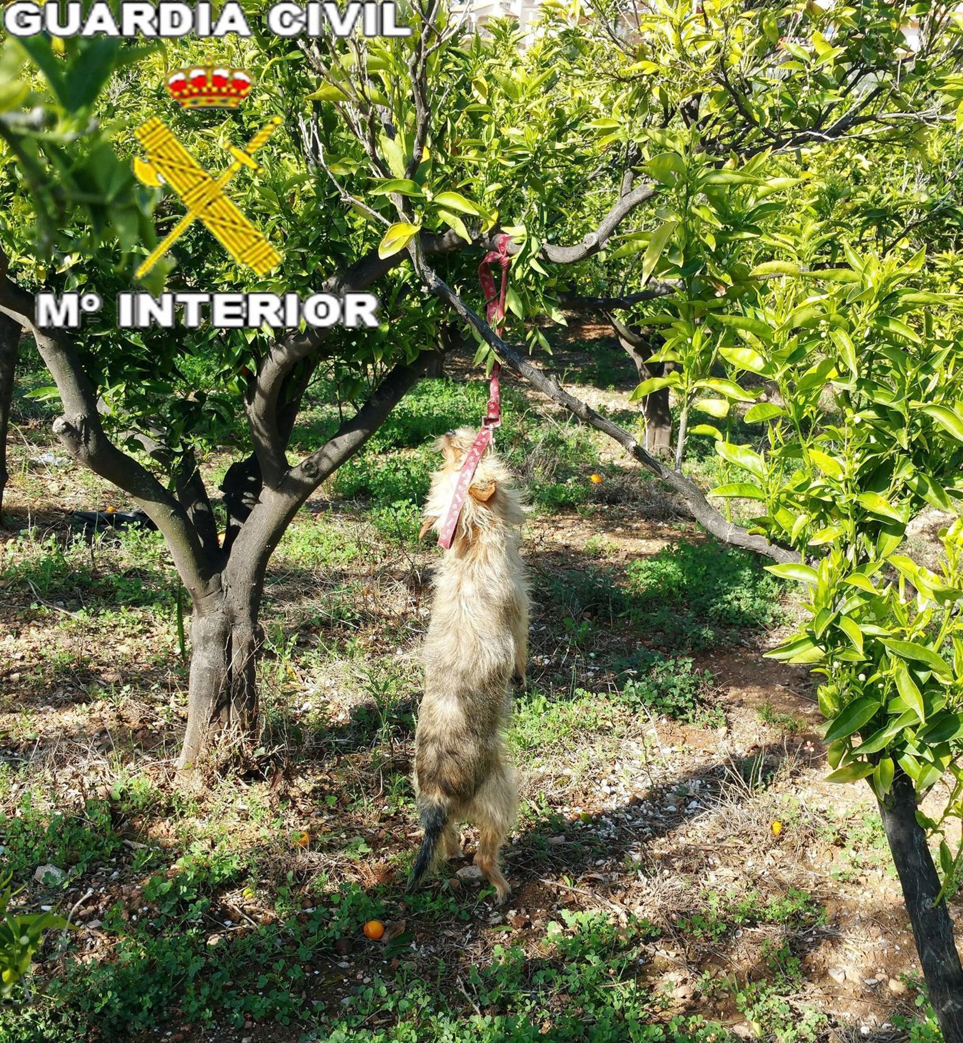 A la vista de los datos ofrecidos por el auxiliado se realizó una batida por los lugares relatados, donde se localizó en el interior de un campo de naranjos ubicado en Partida Bovalar de Onda uno de los perros de su propiedad, el cual había sido ahorcado tras rodearle un cinturón sobre el cuello y atar el otro extremo en uno de los árboles.