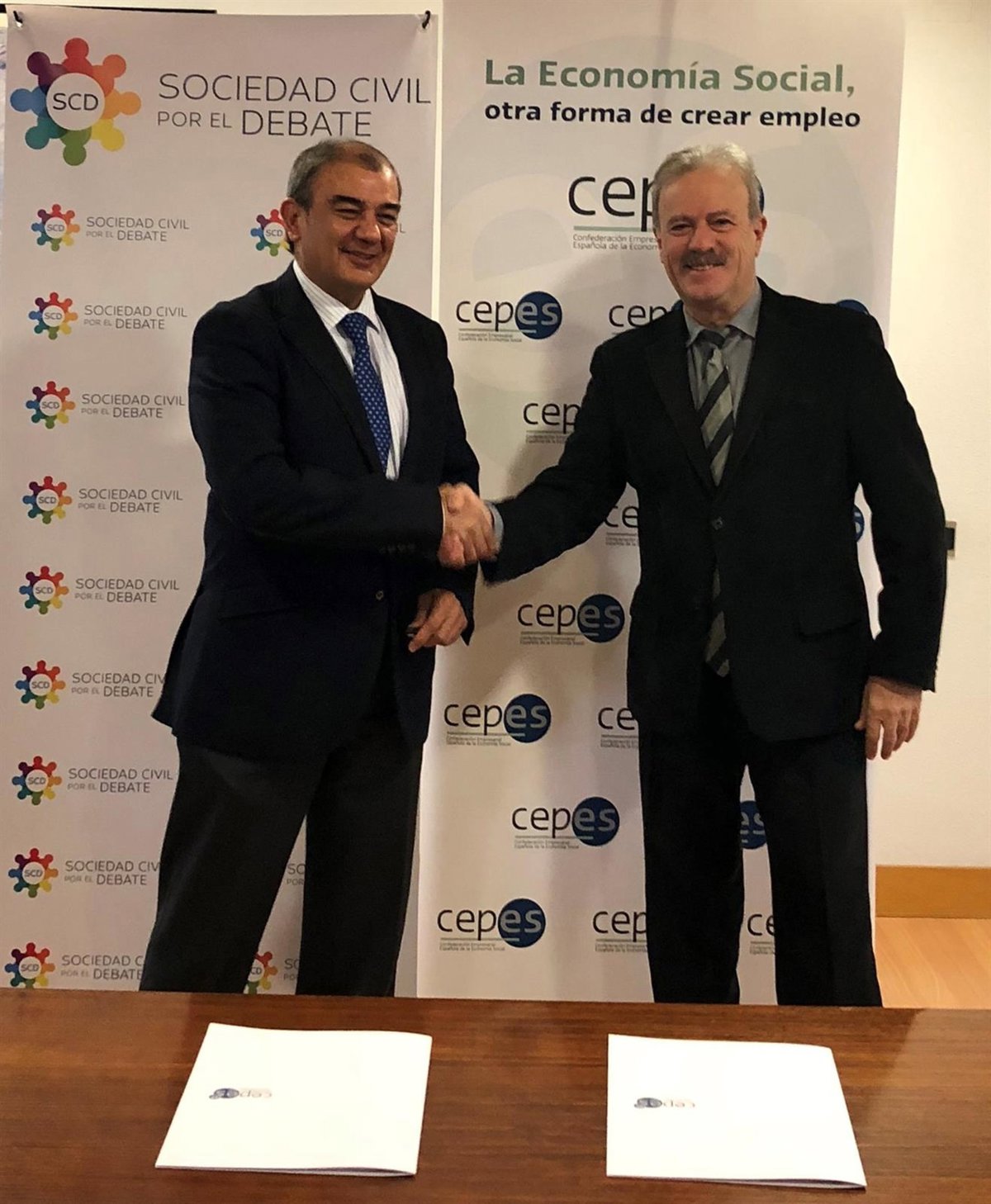 Los presidentes de la Confederación Empresarial Española de la Economía Social (CEPES), Juan Antonio Pedreño, y de Sociedad Civil por el Debate, Manuel Campo Vidal, han firmado un convenio marco de colaboración entre ambas entidades para dinamizar el debate público en Economía Social y sobre los asuntos que preocupan a la sociedad española, según informan en un comunicado.