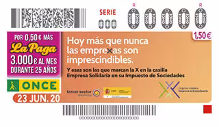 Un total de 5,5 millones de cupones de la ONCE con la frase Empresa solidaria, empresa extraordinaria han salido a la venta este martes 23 de junio para animar a las empresas a marcar la casilla del 0,7% del Impuesto de Sociedades, con la que se han recaudado más de 33 millones de euros en su primer año de funcionamiento y con la que estiman que podrían llegar a recaudar 177 millones de euros si todas las empresas la marcasen.