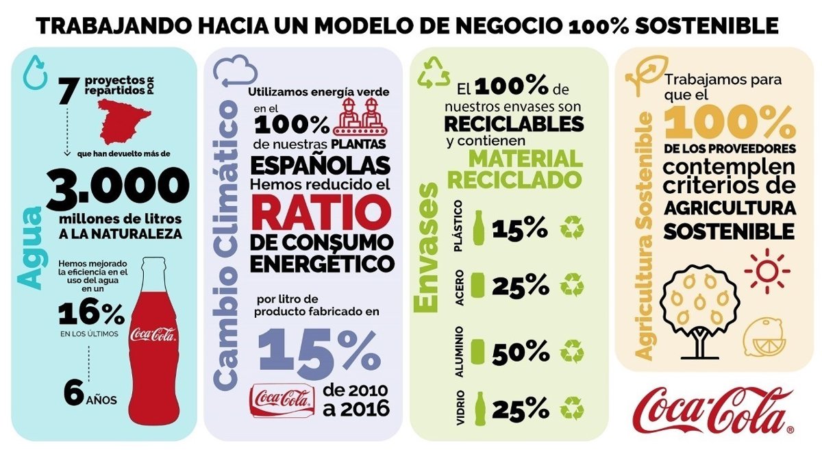 Con respecto al segundo eje, el compromiso sostenible en clima, envases y agricultura sostenible, Coca-Cola ha asegurado que utiliza energía 100% renovable en todas sus plantas españolas y el 100% de los envases que Coca-Cola pone en el mercado son reciclables. También, la compañía ha conseguido reducir el ratio de consumo energético por litro de producto fabricado en un 15% de 2010 a 2016 e impulsa medidas destinadas a reducir las emisiones para alcanzar su objetivo de reducir la huella de carbono en un 25% en toda la cadena de suministro.