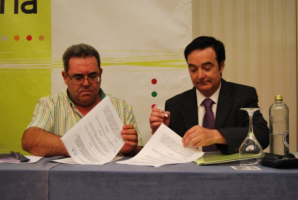 El presidente de Cooperativas Agro-Alimentarias de Extremadura, Matías Sánchez, y el presidente de Cocemfe-Badajoz y Apamex, Jesús Gumiel, han rubricado este convenio, por el que estas entidades realizarán una labor de coordinación y apoyo mutuo en todas las acciones que favorezcan la integración de las personas con discapacidad física y orgánica en la región.