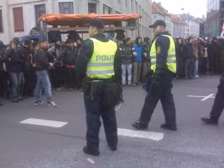 'Refugiado' en un bar de Christiania, el barrio de Copenhague que más se parece a Amsterdam --está permitido vender, comprar y consumir drogas blandas-- relata cómo después del lanzamiento de alguna piedra en medio de la manifestación, la policía danesa cerró una calle y detuvo al millar de personas que se encontraban en ella. Según su relato, no fue trasladado a ninguna comisaría sino que permaneció en la calle hasta que finalmente decidieron liberarlo.