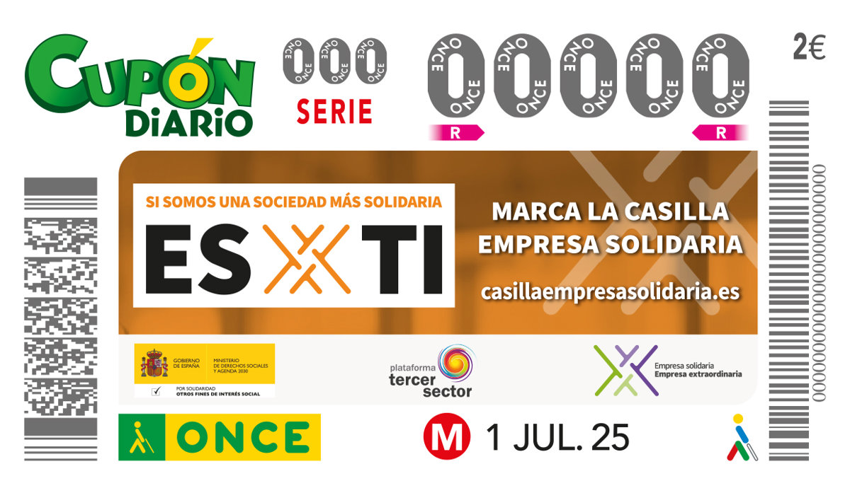 La ONCE dedica su cupón de este martes, 1 de julio, a animar a marcar la Casilla Empresa Solidaria y cinco millones de cupones recorrerán España con la frase 'Si somos una sociedad más solidaria es por ti'.