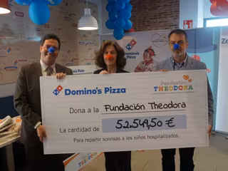 Domino's Pizza ha entregado recientemente un cheque por valor de 52.549,50 euros a la Fundación Theodora España, dentro de la campaña 'Ayudando a sonreír', un proyecto que, a través de sus Doctores Sonrisa, se encarga de llevar la felicidad y optimismo a los niños hospitalizados en más de 23 hospitales con áreas pediátricas de toda España.