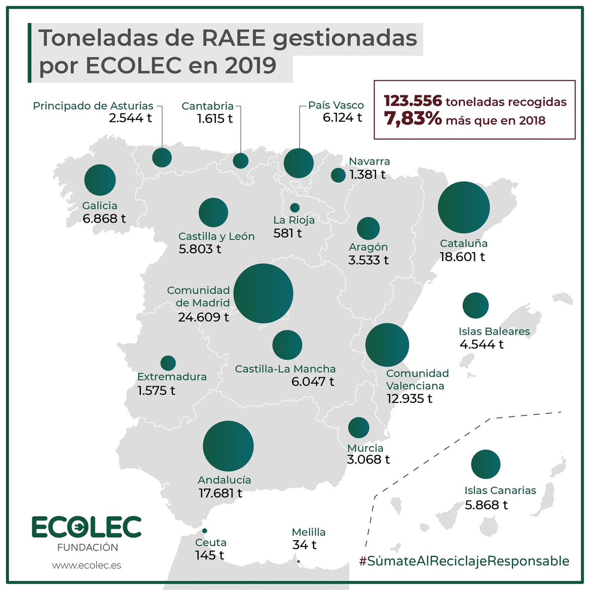 La Fundación Ecolec es el único sistema colectivo de responsabilidad ampliada del productor (SCRAP) que superó las 100.000 toneladas anuales durante tres años consecutivos. Según ha informado la entidad, las cuatro comunidades autónomas que más residuos electrónicos que más toneladas gestionaron fueron Madrid, Cataluña, Andalucía y Comunidad Valenciana.