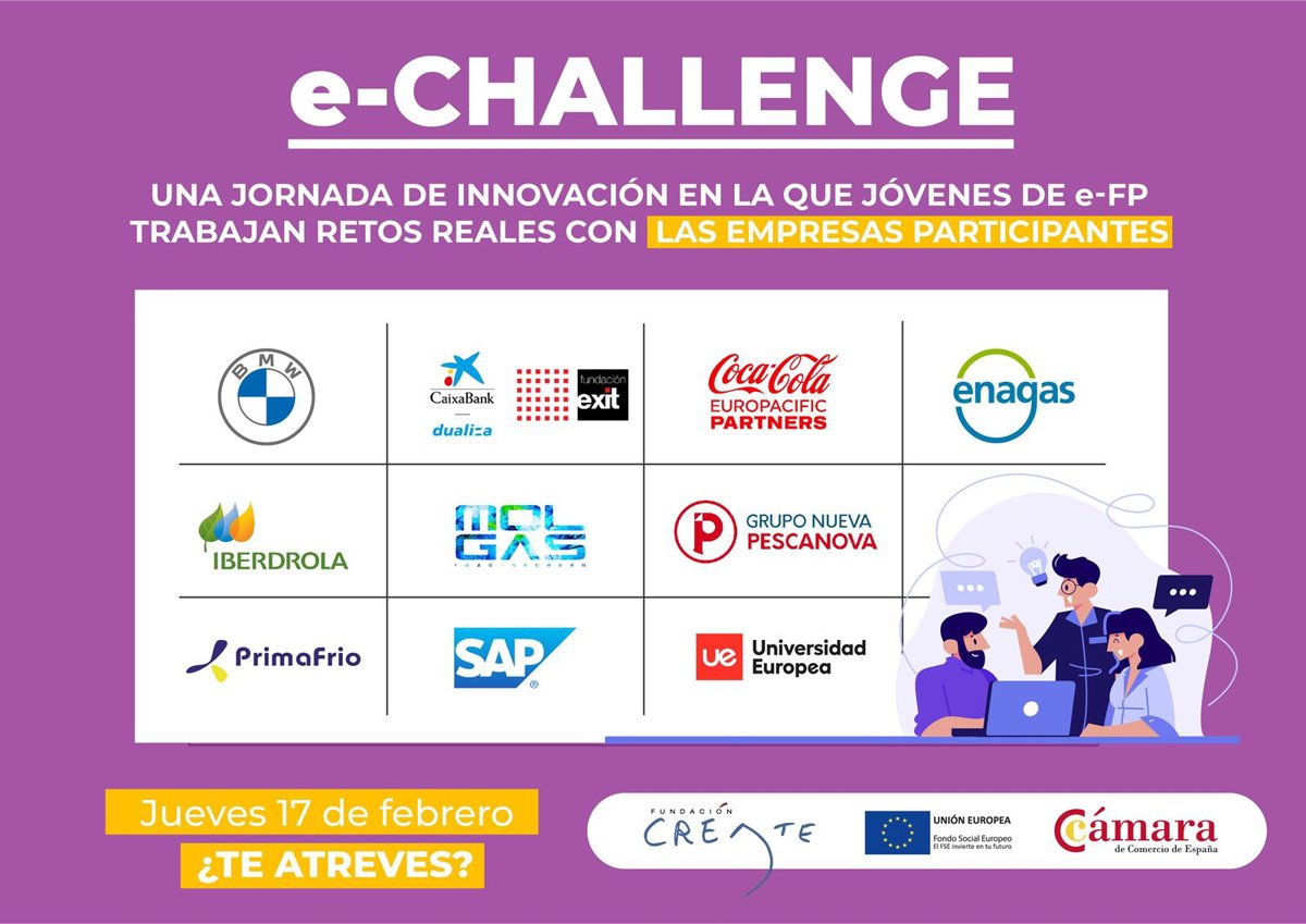 e-FP, un programa de la Fundación Créate y la Cámara de Comercio de España, ha lanzado una nueva edición de e-Challenge, que permitirá a 50 estudiantes de Formación Profesional aportar soluciones innovadoras a las necesidades de 12 empresas.