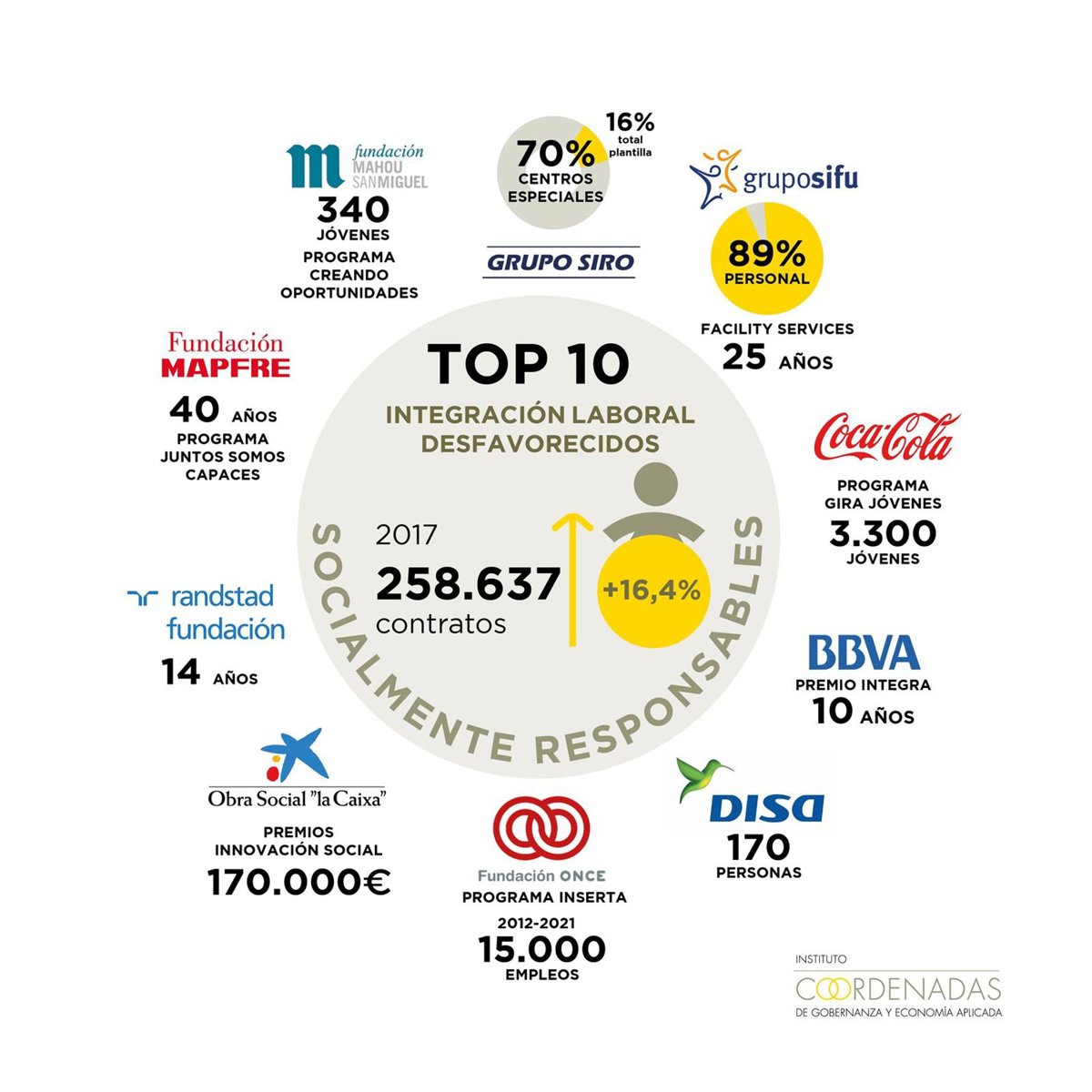 Las empresas líderes españolas impulsan la integración laboral de personas con discapacidad, según constata un estudio realizado por el instituto Coordenadas de Gobernanza y Economía Aplicada sobre la situación de la integración laboral en España en el que se destaca a las principales empresas y fundaciones de empresas que más están apostando por la integración de estos colectivos y su impacto transformador en la sociedad.