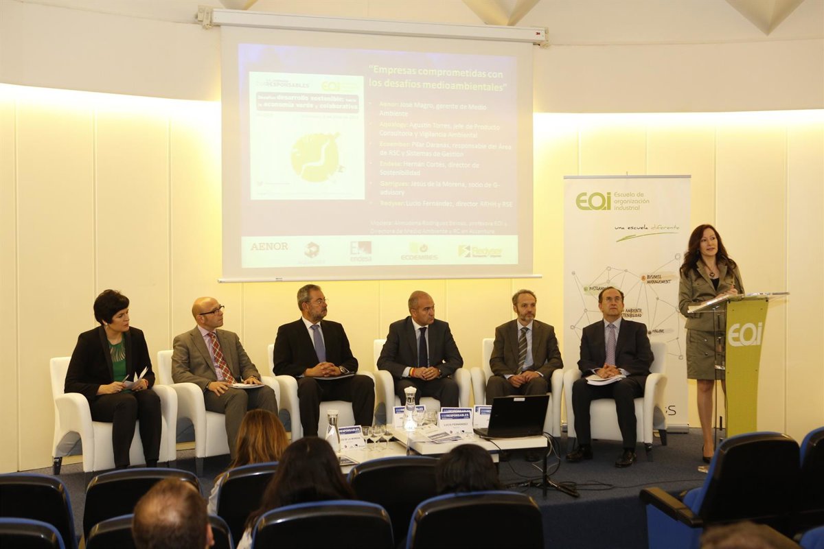 La mesa debate 'Empresas comprometidas con los desafíos medioambientales' ha estado moderada por Almudena Rodríguez, profesora de la EOI y directora de Medio Ambiente y RC de Accenture España, y en la que han participado representantes de Aenor, Aqualogy, Ecoembes, Endesa, Garrigues y Redyser.