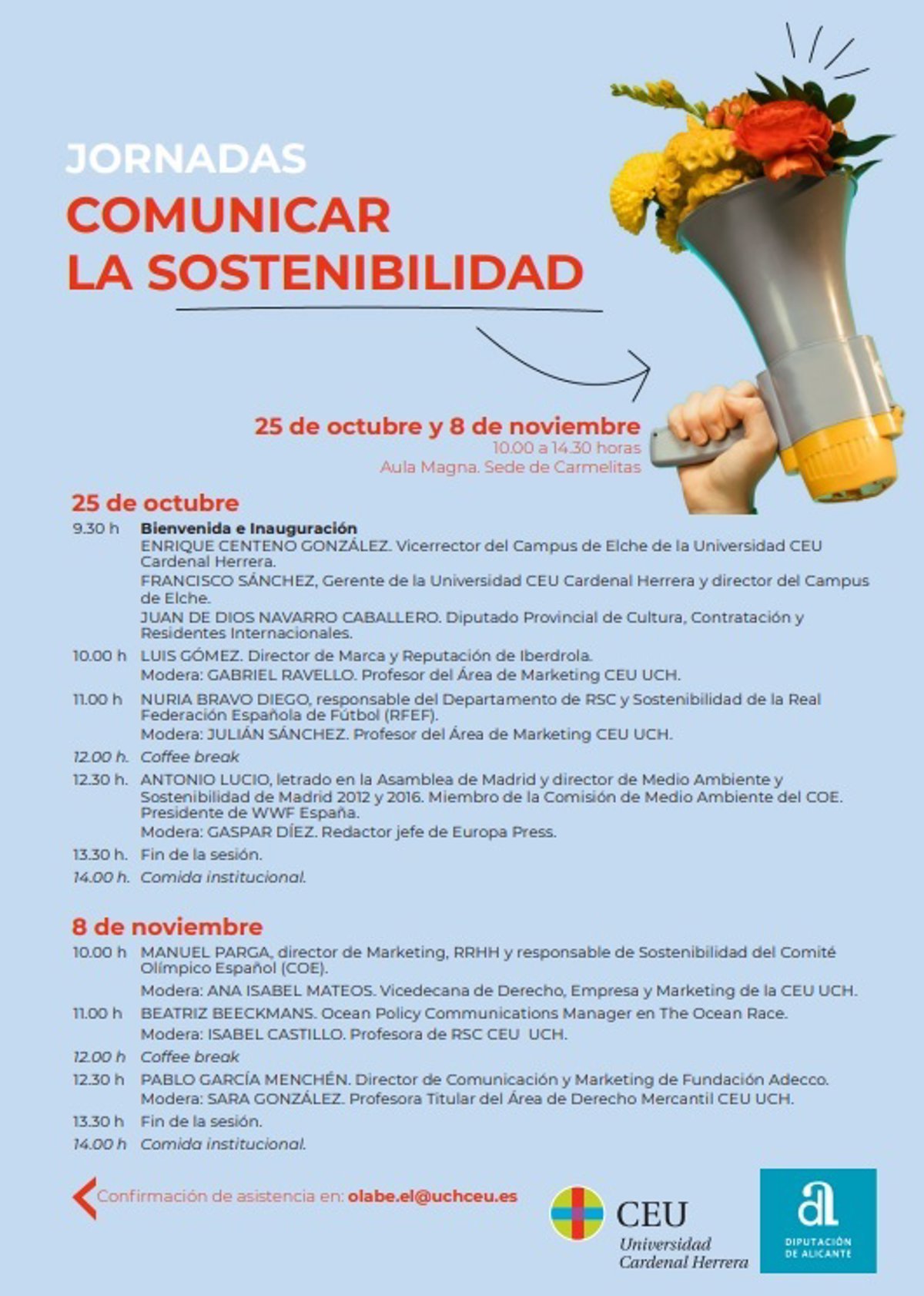 Expertos de Iberdrola, Adecco, The Ocean Race, Comité Olímpico Español (COE) y la Real Federación Española de Fútbol (RFEF), entre otros, participarán en las jornadas 'Comunicar la Sostenibilidad', organizadas por la Universidad CEU Cardenal Herrera en Elche y que se celebrarán el 25 de octubre y 8 de noviembre.