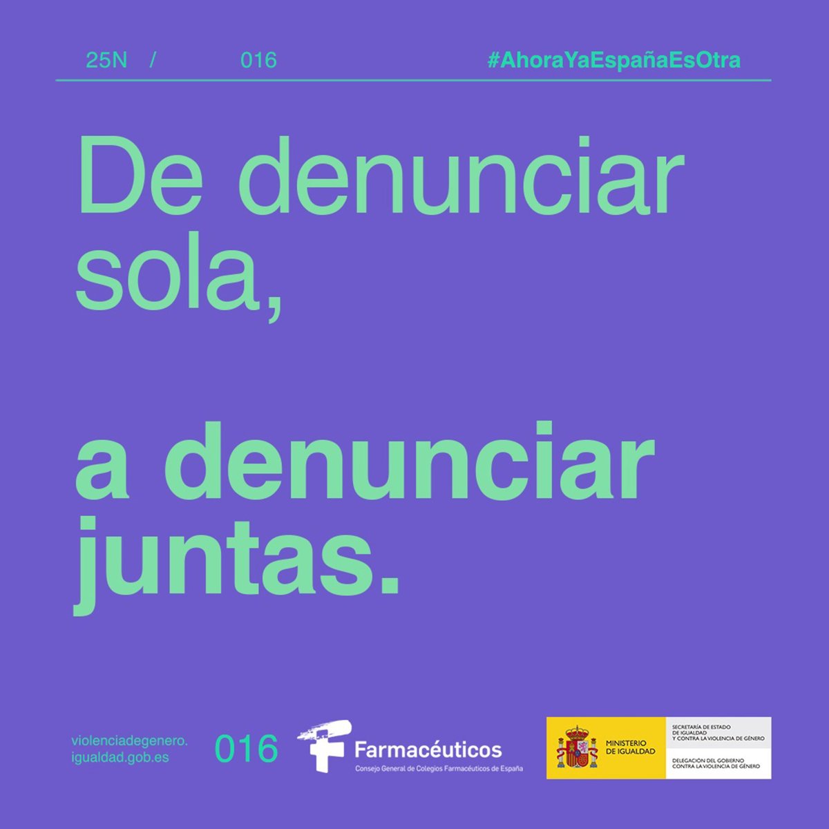 El Consejo General de Colegios Farmacéuticos (CGCF) se suma a la campaña 'Ahora ya España es otra', desarrollada por el Ministerio de Igualdad con motivo del Día Mundial de la Violencia de Género, que se conmemora este 25 de noviembre - CGCF