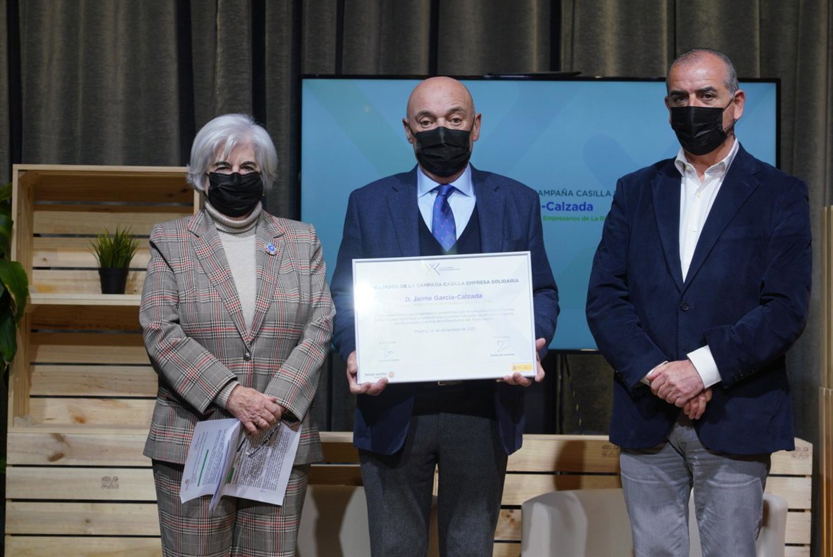 El presidente de la Federación de Empresas de La Rioja, Jaime García-Calzada, recibió ayer en el transcurso de un acto celebrado en Madrid, el reconocimiento como Embajador de la campaña 'Casilla Empresa Solidaria' del Impuesto de Sociedades, que ha desarrollado en los últimos años la Plataforma del Tercer Sector (PTS) en nuestro país. www.casillaempresasolidaria.es