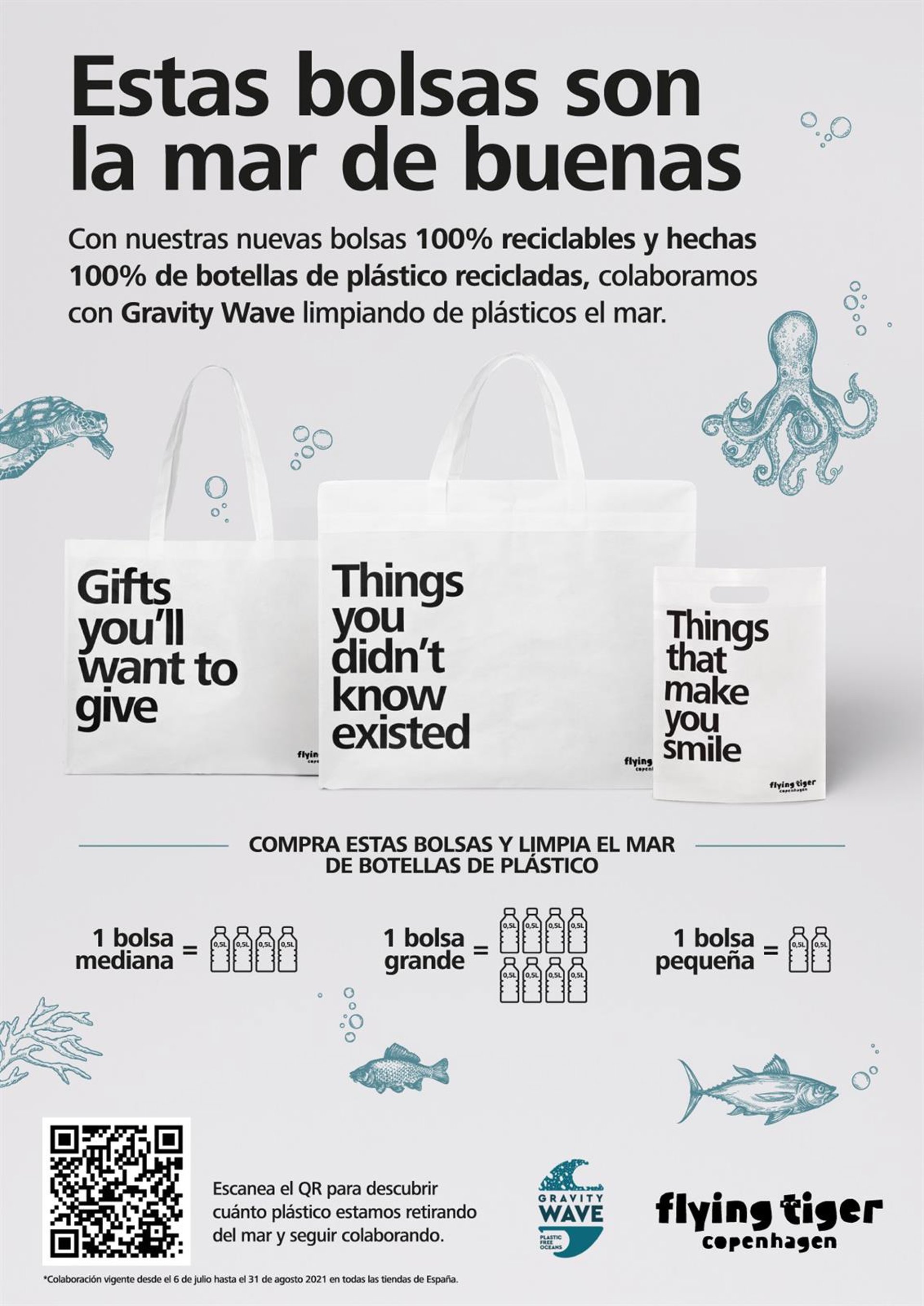 La compra de una bolsa pequeña equivale a retirar del mar dos botellas de medio litro; por una bolsa media, cuatro botellas y por una bolsa grande, ocho botellas de medio litro, detalla Flying Tiger que también partipa con 'Plastic Free Ocean', formando parte de la red de compañías concienciadas con la limpieza y protección de los mares.