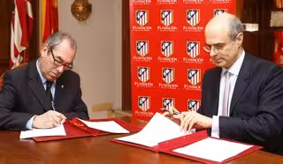 El presidente de la Fundación Atlético de Madrid, Adelardo Rodríguez, y el consejero delegado de IPSEN Pharma SA, Thibuad Eckenschwiller, sellaron en el Vicente Calderón el acuerdo en el que se inscribe el desarrollo y las acciones de dicha campaña.