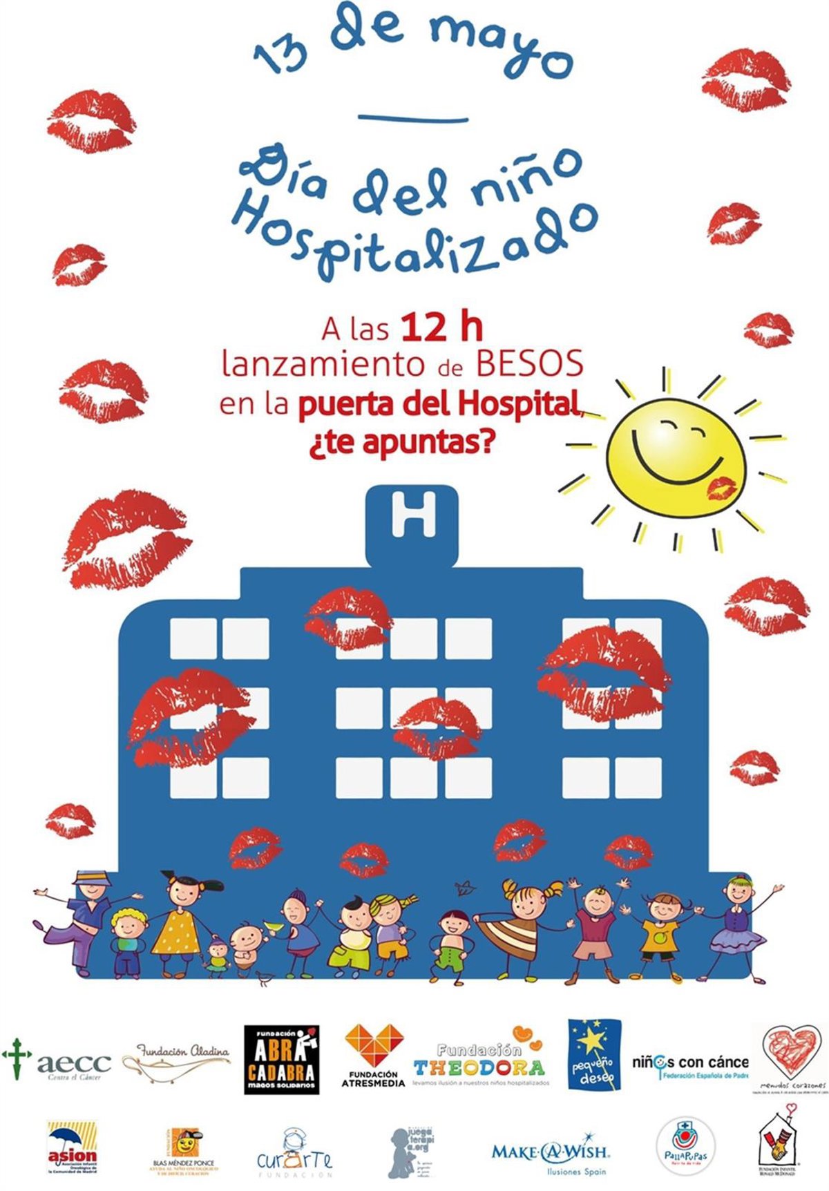 La Fundación Atresmedia, en colaboración con las principales entidades y asociaciones vinculadas a la atención hospitalaria infantil, celebra este viernes 13 de mayo el Día Nacional del Niño Hospitalizado, con el lanzamiento de besos para rendir homenaje a los menores ingresados en los hospitales, sus familias, personal sanitario y a los voluntarios.