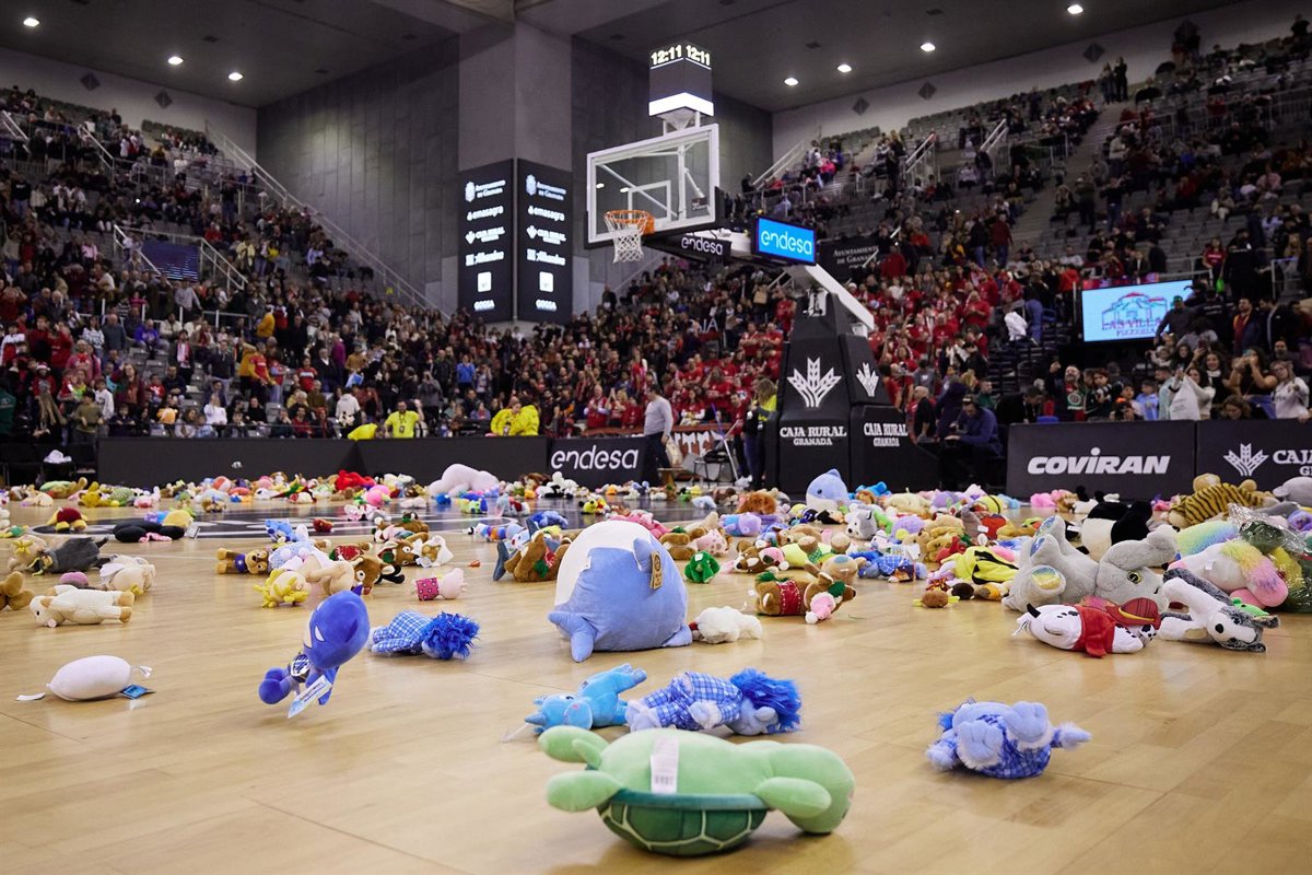 El Coviran Granada ha celebrado una nueva lluvia de peluches, con el apoyo de Fundación Caja Rural Granada, durante el descanso del encuentro del sábado, 27 de diciembre, entre el conjunto rojinegro y el UCAM Murcia.