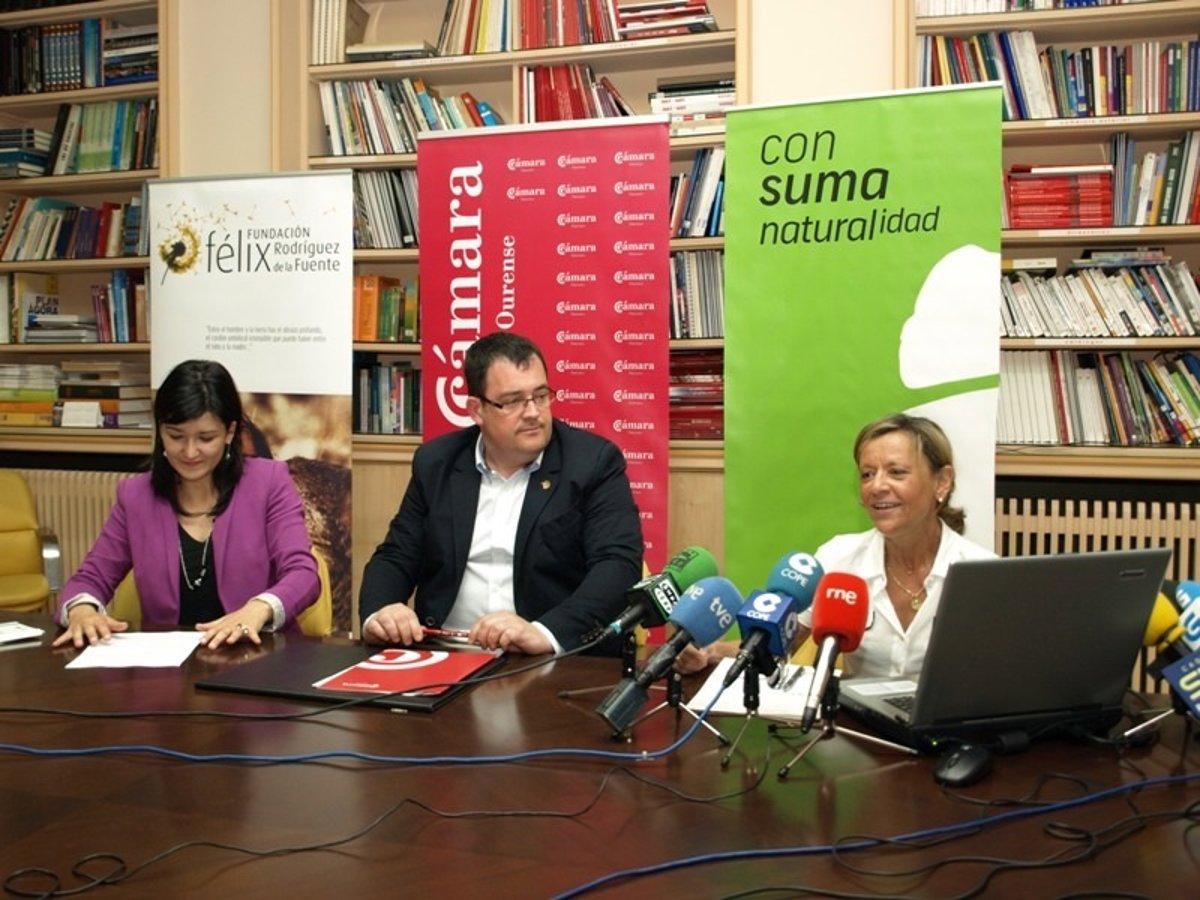La directora de la Fundación Félix Rodríguez de la Fuente, Fernanda Serrano, y el presidente de la Cámara de Comercio de Ourense, Celso Barbosa, han presentado este miércoles el sello, que dispone de fondos del instrumento comunitario 'LIFE+'. También asistió al acto la edil de Limpieza del Ayuntamiento de Ourense, Susana Bayo.
