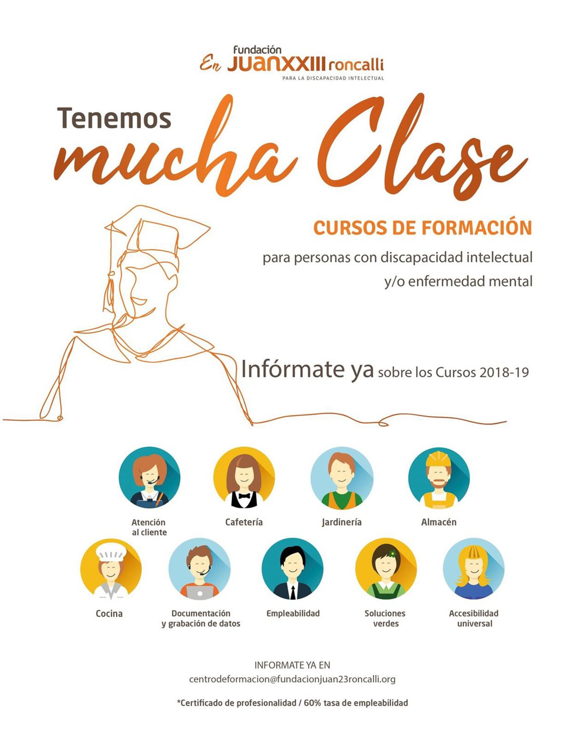 De este modo, del 1 al 15 de septiembre, cualquier persona con discapacidad intelectual y/o enfermedad mental podrá inscribirse a través de la página web de la Fundación en los nueve cursos que se impartirán durante la promoción 2018/2019. Todos ellos, gratuitos para los alumnos gracias al apoyo de la Administración Pública y de las empresas que creen en este proyecto y lo respaldan.