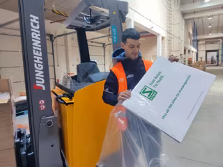 Trabajador de los servicios logísticos de Fundación Juan XXIII transportando productos de Schwabe Farma Ibérica tras el acuerdo de ambas entidades para fomentar la inclusión sociolaboral de personas en situación de vulnerabilidad piscosocial. - FUNDACIÓN JUAN XXIII Y SCHWABE FARMA IBÉRICA