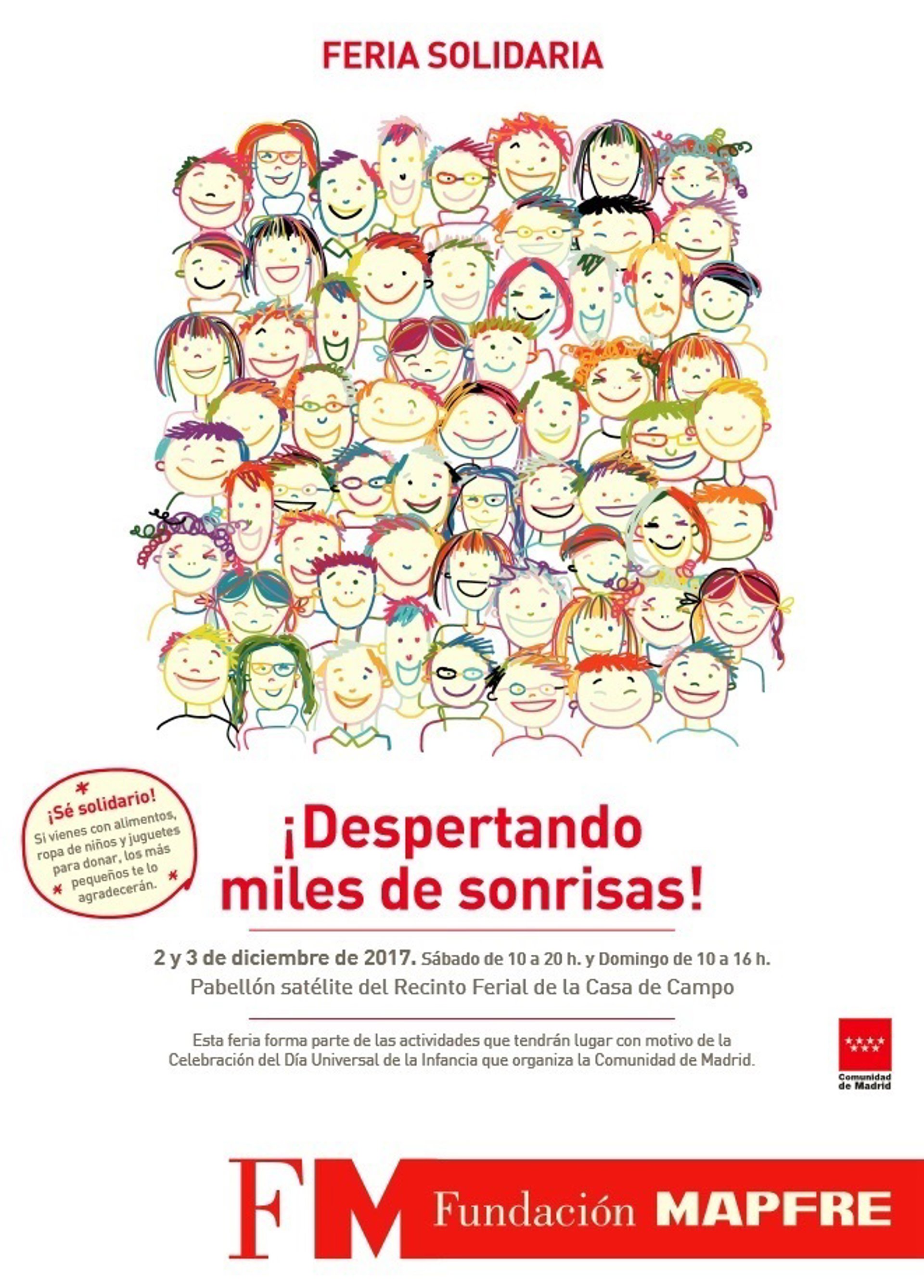 Fundación MAPFRE celebra los próximos 2 y 3 de diciembre en el Recinto Ferial de la Casa de Campo de Madrid, en el marco de las celebraciones del Día Universal de la Infancia, su Feria Solidaria bajo el lema '#MásdeMilSonrisas', con el objetivo de recaudar fondos destinados a UNICEF para ayudar a los niños afectados por los últimos seísmos en México, según ha informado la fundación.