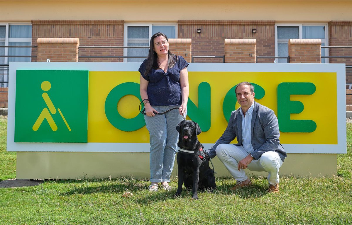 María Jesús Varela, directora de la Fundación ONCE del Perro Guía y Javier Martínez, director general de Royal Canin junto a un perro guía. - FUNDACIÓN ONCE