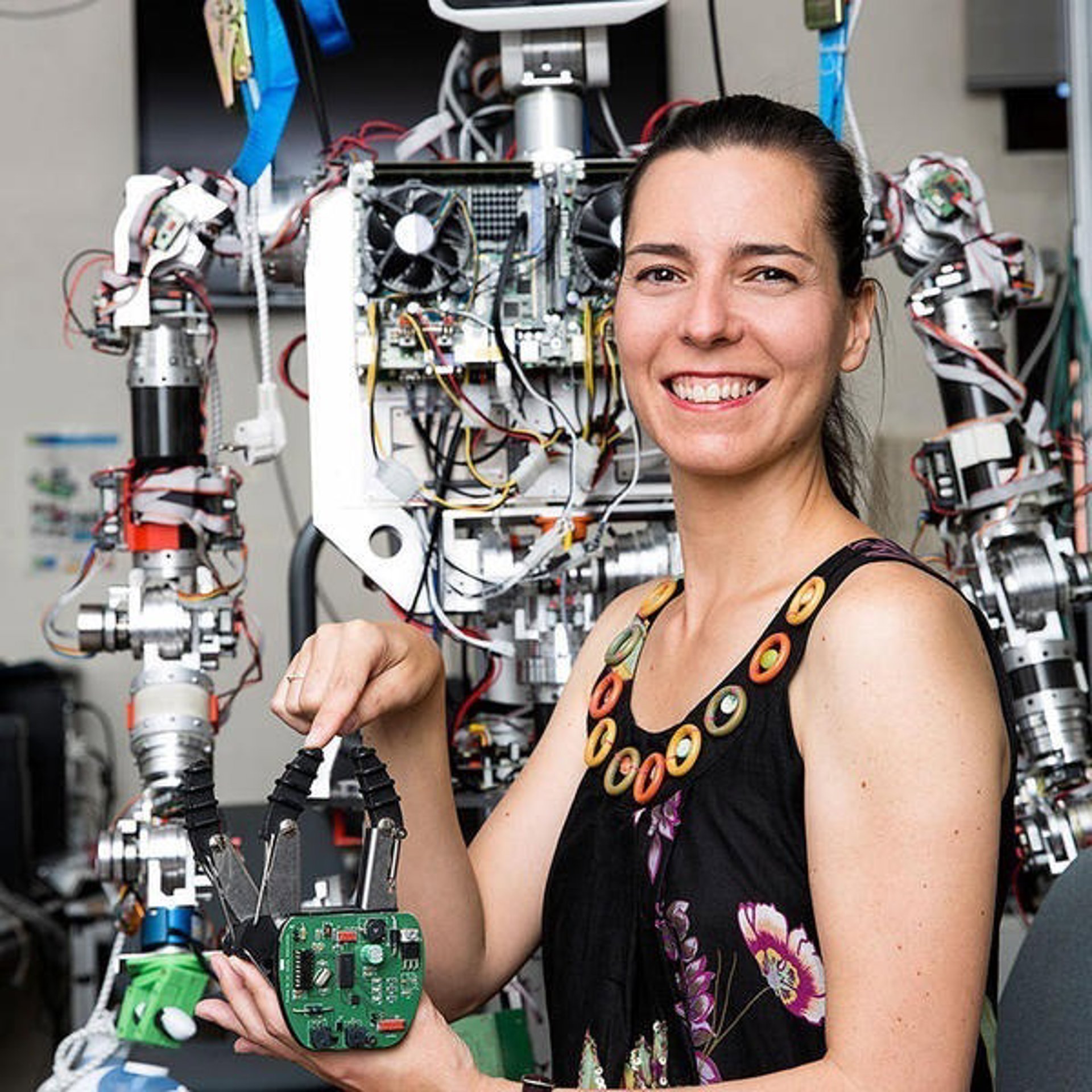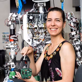 La investigadora detalla que su trabajo con TEO "se centra principalmente en su sistema de control, que es el elemento vital que permite dotar al robot de estabilidad y seguridad durante el desempeño de sus tareas. Actualmente estoy desarrollando extremidades blandas para este y otros robots".