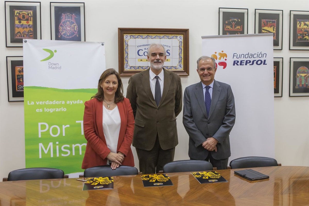 El convenio fue firmado por Julio L. Martínez, SJ, rector de Comillas ICAI-ICADE; Ignacio Egea, vicepresidente de Fundación Repsol e Inés Álvarez, presidenta de Down Madrid. Al acto también acudieron Fernando Vidal, director del Instituto de la Familia; Lola Zamarra, directora del área Social y de Voluntariado de Fundación Repsol; Ana Berástegui y Noemí García Sanjuán, directora y coordinadora de la Cátedra, y Elena Escalona, directora general de Down Madrid.