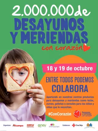 Los hipermercados Alcampo, los supermercados Simply y los centros comerciales Immochan han puesto en marcha la campaña Desayunos y Meriendas #ConCorazón con el objetivo de conseguir dos millones de desayunos y meriendas para los niños que más lo necesitan.
