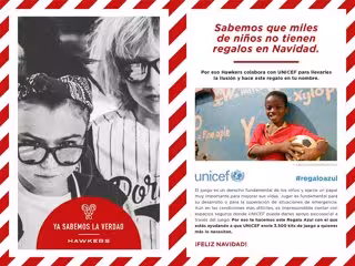 A partir de este 14 de diciembre y durante una semana, todos los que compren un producto a través de todos los canales de la marca ya sea su ecommerce o sus recién estrenados puntos de venta físicos (su flagship store en el centro de la capital o una de sus 22 microstores distribuidas por todo el país), recibirán unas postales y christmas digitales de UNICEF y diseñadas por Hawkers.