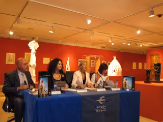 La directora de la Obra Social de Ibercaja, Teresa Fernández, la responsable del programa de Educación y Cultura de la entidad, Magdalena Lasala, y los comisarios de la muestra Pere Jordi Figuerola y Charo Sanjuán, han presentado en rueda de prensa esta exposición organizada por la caja aragonesa en colaboración con el Museo Diocesano de Barcelona, la Cátedra Gaudí y Àurea Cultura i Art.