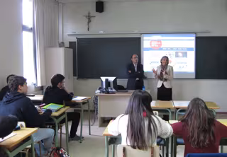 La presentación de la nueva página web se ha llevado a cabo en el Colegio Salesianos de Zaragoza, donde Teresa Fernández y el director del centro, Eduardo Marco, han participado en una simulación práctica del programa que se ha realizado con un grupo de alumnos de cuarto de Secundaria.