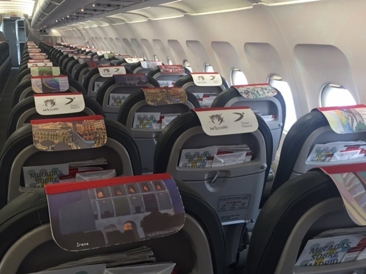 Iberia Express colabora con el programa 'Arte Down', promovido por la Fundación Síndrome de Down de Madrid en la labor de difusión de la exposición 'Miradas sobre Madrid', decorando los cabezales de un avión A320 de su flota durante tres meses con las doce obras de los artistas que integran la muestra.